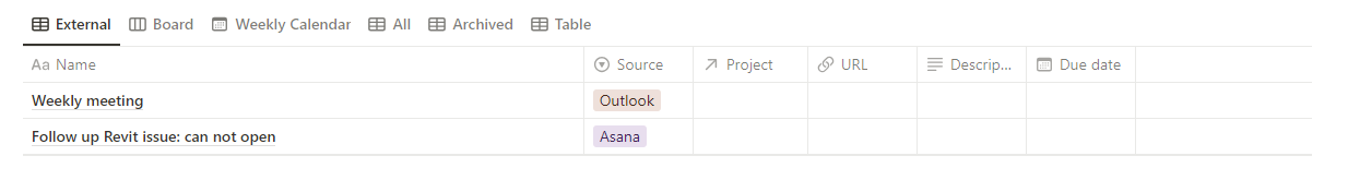 When a new Asana task is created, a corresponding task (Notion database item) is automatically created within seconds and appears in the External view. From here, I can reorganize the task by assigning a due date, adding tags, and including notes, among other actions.