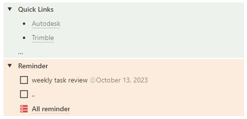 Today and Up Coming: these are the linked views of the detailed task database, displaying tasks for today and upcoming days.